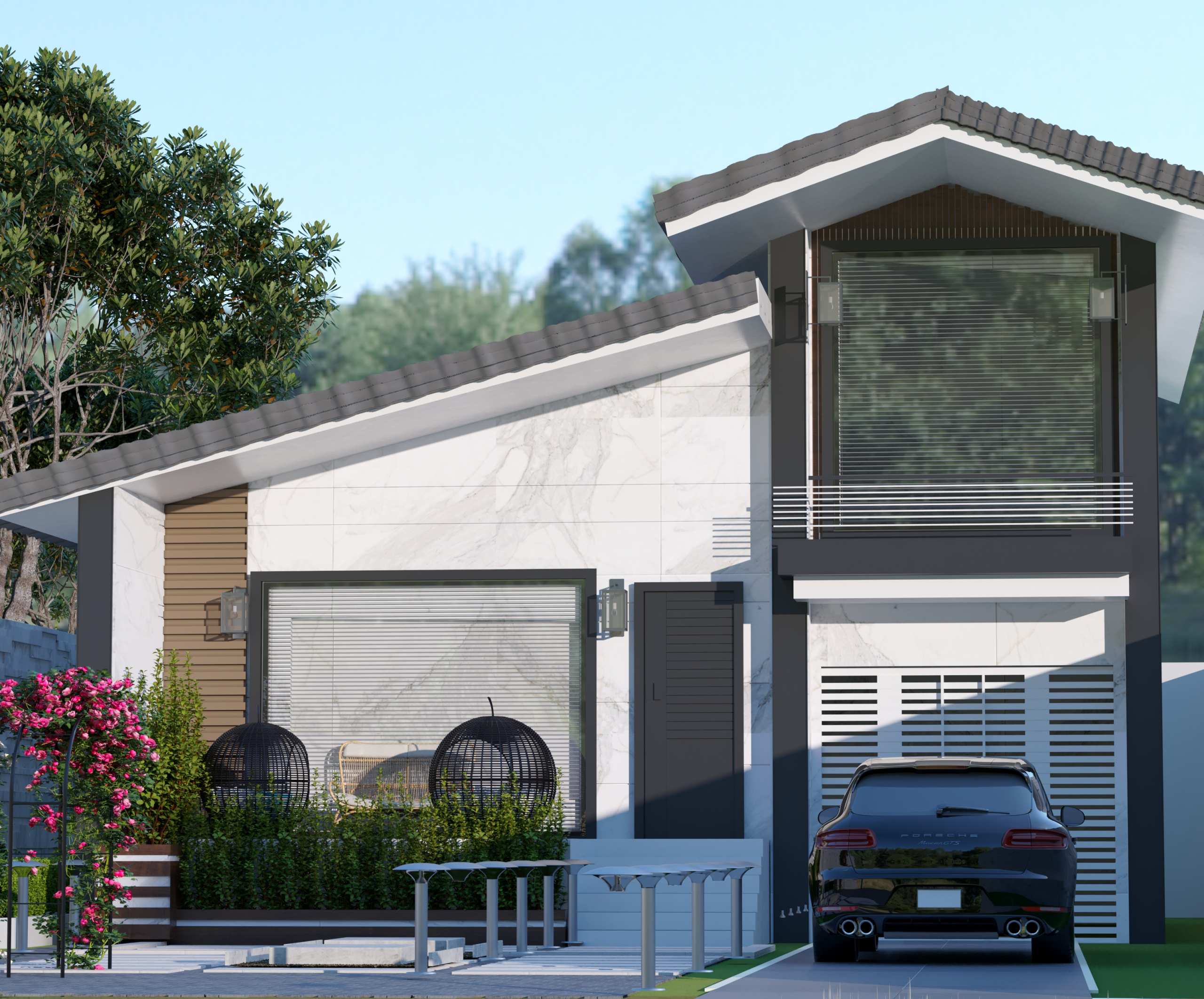 نمای این بنا با الهام از معماری مدرن طراحی شده و ترکیبی از خطوط مینیمال، رنگهای متضاد و بازشوهای وسیع شیشهای است. تضاد رنگی میان حجم تیرهی طبقه بالا و بدنه روشن ساختمان، هویتی خاص و چشمگیر به پروژه بخشیده است.