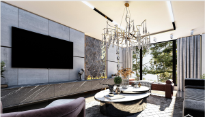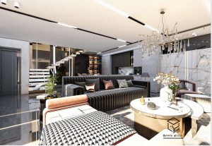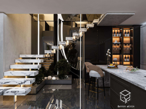 طبقه پایین این پروژه با سبکی مدرن و لوکس طراحی شده است. کفپوش سنگی براق همراه با نورپردازی دقیق، فضایی روشن و چشمگیر ایجاد میکند.