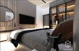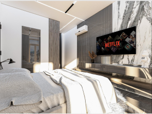 قرارگیری تلویزیون دیواری روبهروی تخت، فضایی مناسب برای اوقات فراغت و تماشای فیلم ایجاد کرده است. پردههای بلند و پنجرههای بزرگ، امکان ورود نور طبیعی و ارتباط مستقیم با تراس را فراهم میسازند و تجربهای نزدیک به طبیعت را به ساکنان هدیه میدهند.